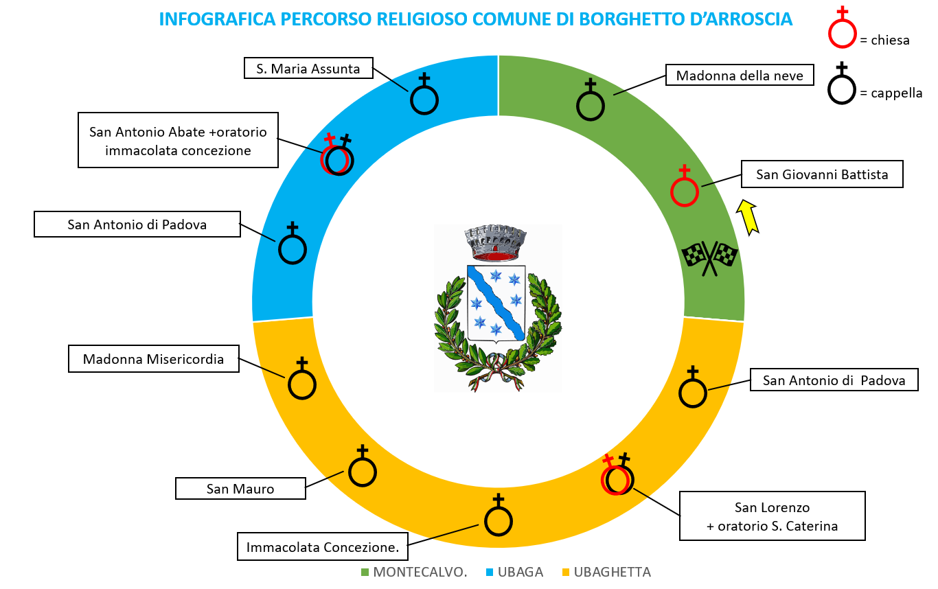 Di seguito è descritto e suggerito un percorso religioso attraverso luoghi (capelle, chiese, sentieri) storici di culto e preghiera attraverso il territorio di tre paesi confinanti appunto Montecalvo Ubaga Ubaghetta siti nel comune di Borghetto d’Arroscia sul versante destro del torrente Arroscia.
